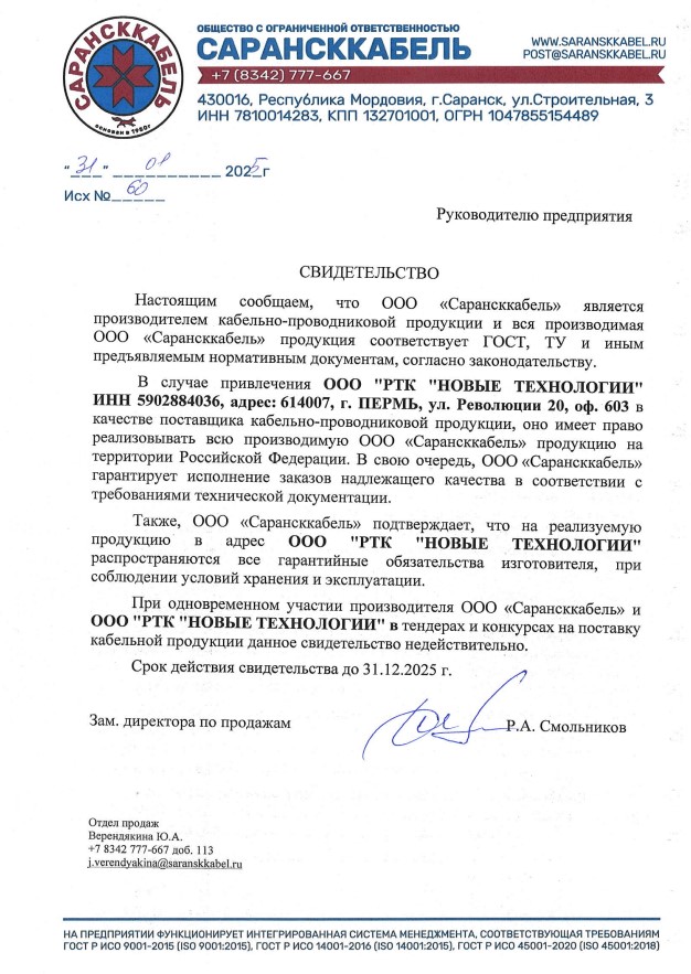 Свидетельство ООО "САРАНСККАБЕЛЬ"